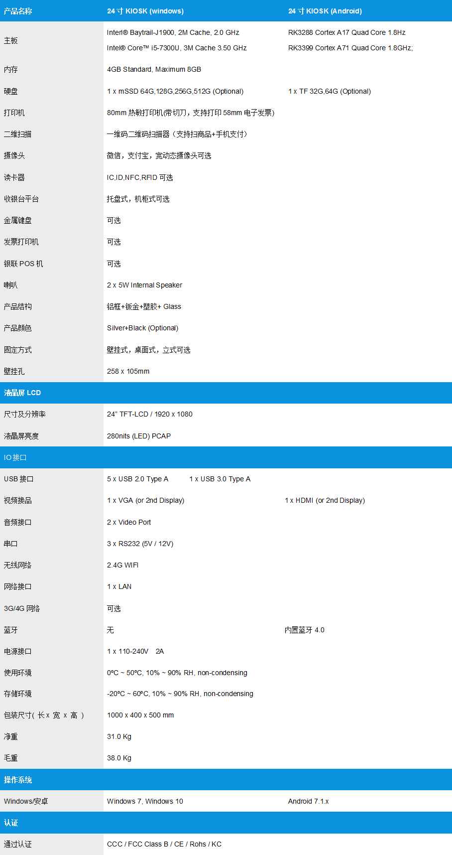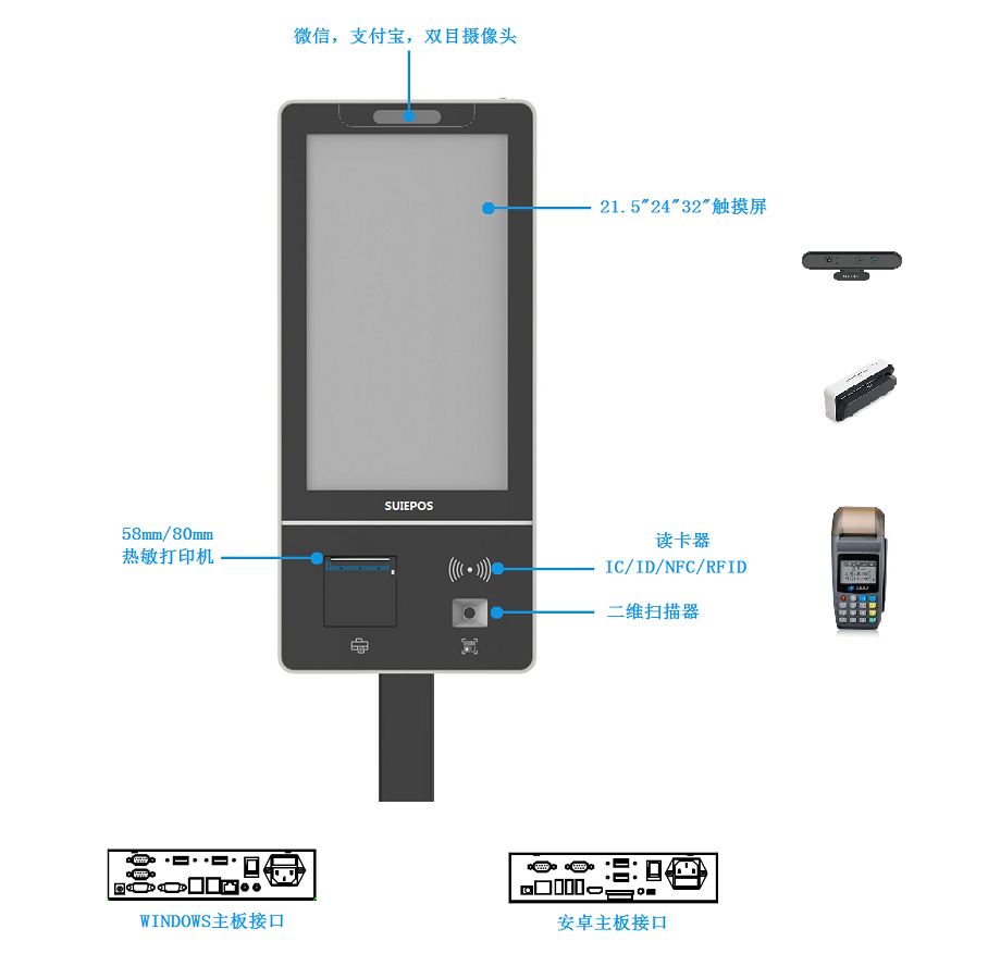 可選配件: 二維掃描器,NFC讀卡器,58/80mm熱敏打印機